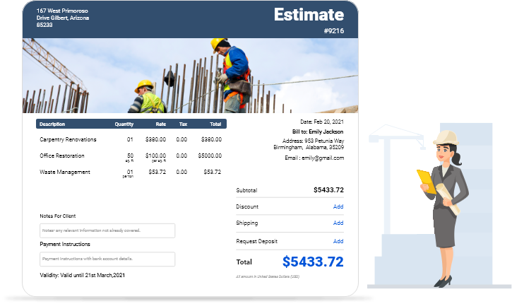 When submitting bids, study the construction plans carefully and create a detailed roadmap. Use InvoiceOwl to create professional estimates that accurately calculate material and labor costs. This helps you submit competitive bids while protecting your profit margins.