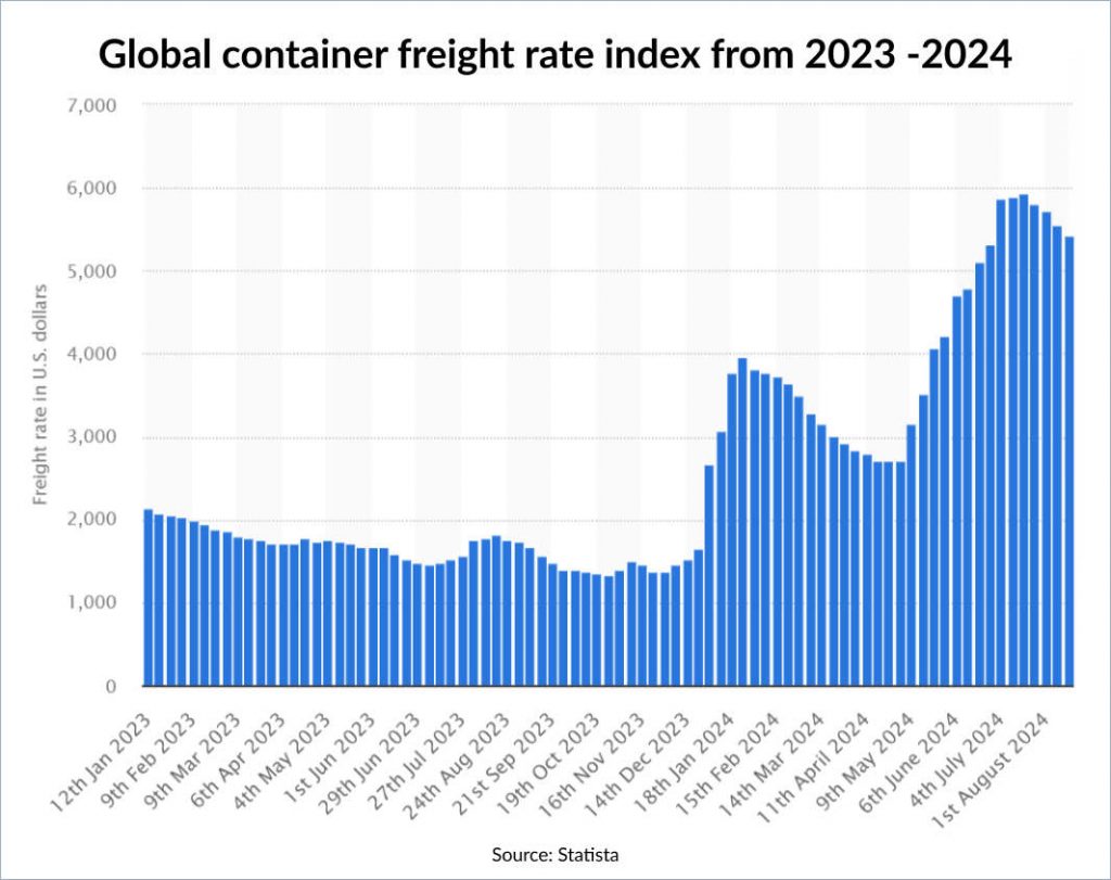 FOB terms significantly affect shipping costs, inventory, and insurance. Recently, global freight rates have risen sharply. Between 2023 and 2024, shipping costs increased dramatically, with container rates exceeding 5,900 U.S. dollars in July 2024.