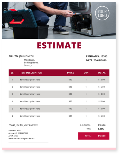 The following are essential to mention when writing an estimate for an appliance repair service: Estimate date, estimate expiry date, services to be included, equipment needed to rent, spare parts to be repaired/replaced, visiting charges (if any), labor costs, applicable taxes and discounts, the total quotation amount, and payment instructions.