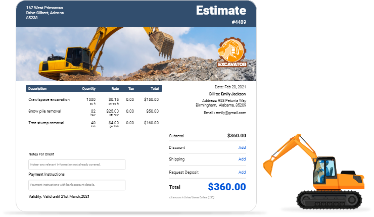 Create, send, and manage customized estimates for your excavation contractor business in just a few minutes. Track estimate status in real-time and know exactly when clients view your proposals. Autofill client and item details to eliminate repetitive data entry and speed up your workflow.