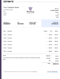 Download professional plumbing estimate templates for licensed plumbers and plumbing contractors. Create detailed quotes for emergency repairs, leak fixes, installations, drain cleaning, and general plumbing services with ready-to-use templates.
