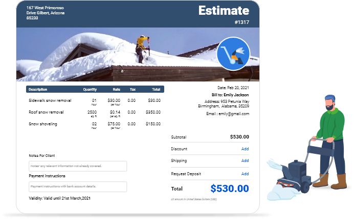 The InvoiceOwl estimating software lets you create, send, and manage customized estimates for your snow removal contractor business in just a few minutes. Stop wasting time on paperwork and focus on growing your business and serving more customers.