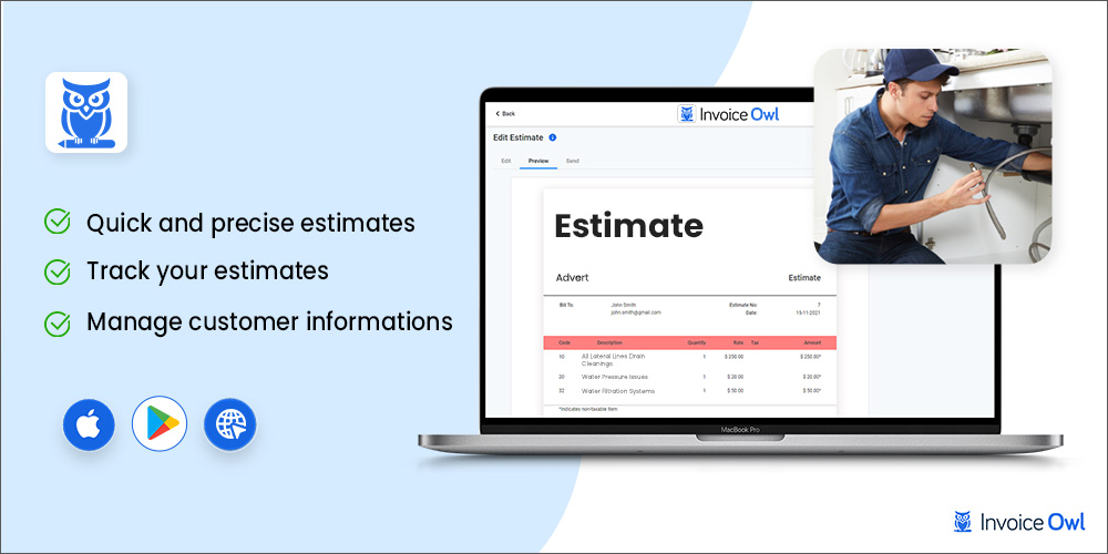 InvoiceOwl automates your plumbing estimate process to make it quick and easy. Create professional estimates, track them in real-time, and get paid faster.