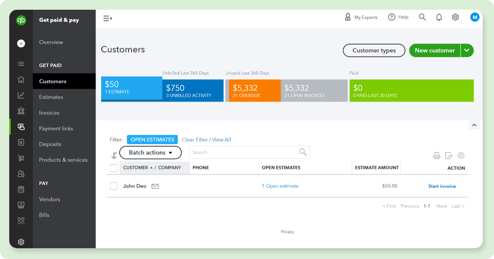 See your data seamlessly synced between InvoiceOwl and QuickBooks Online. Switch between views to see how customers, invoices, and estimates appear after synchronization.