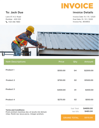 InvoiceOwl templates stand out from the crowd because they are prepared after taking input from roofing industry experts and contractors. The placement of every single element is designed to make the user's journey a cakewalk. You just need to download, fill in your required details, and start sharing. The templates include all the specific line items and fields that roofing contractors need.