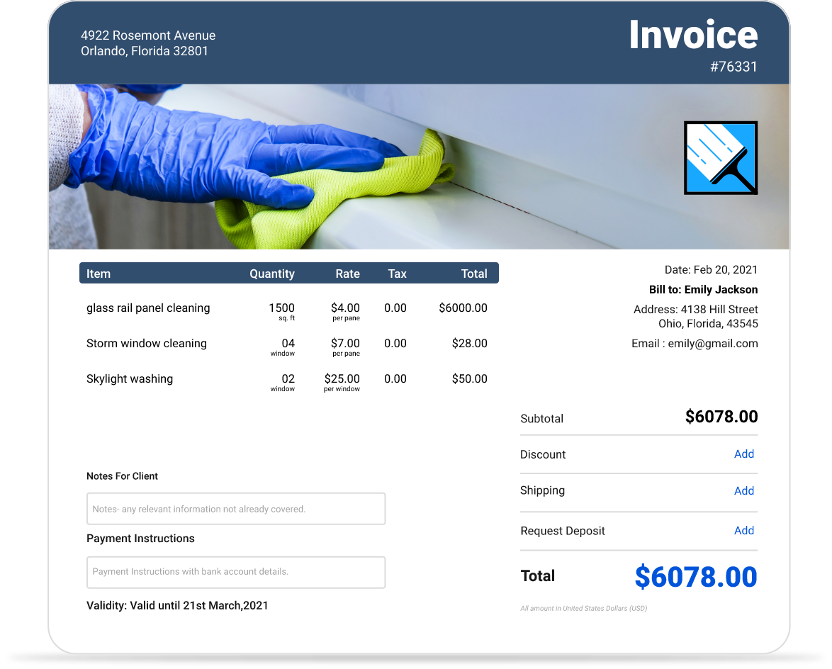 Our templates are specifically designed for window cleaning contractors, with fields for residential and commercial services, per-window pricing, floor-based pricing, interior and exterior cleaning options, screen cleaning, and specialty services like high-rise window cleaning. Simply choose your template, add your client and service details, and send professional invoices in minutes.