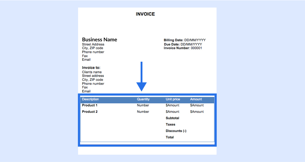 A grid of lines should appear on a large portion of the invoice—where you can key in the goods or services you provided. There should already be a mutually agreed-upon construction contract between you and the client on the fee.